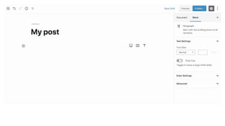 This document provides an overview of building Gutenberg blocks. It discusses writing blocks in ES5 vs ESNext/JSX and using @wordpress/scripts to handle dependencies and configuration. Registering blocks client-side with registerBlockType is covered, along with defining edit and save functions. Attributes, reusable RichText components, and state management are also summarized. Building blocks involves 3 steps - installing packages, registering the block client-side, and adding edit/save functions.