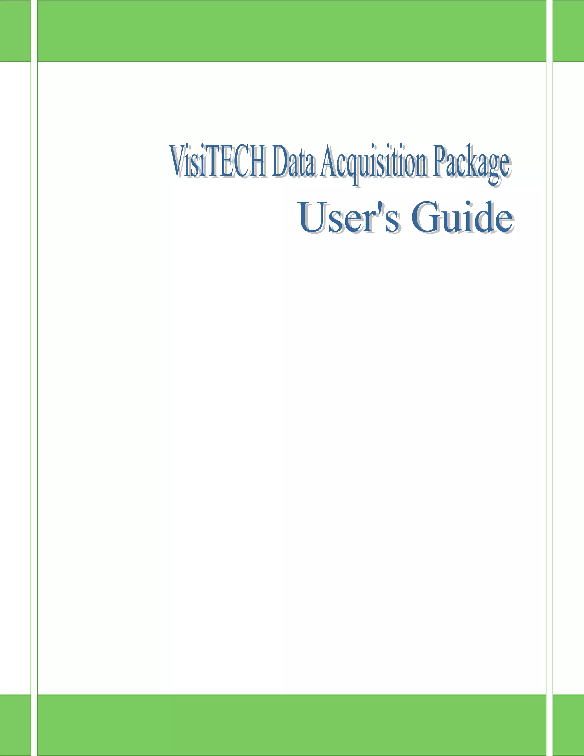 This document provides a user's guide for the VisiTECH Data Acquisition Package. It introduces the package and describes system requirements, licensing, installation, directory structure, and abbreviations. It also outlines the various configuration dialogs for setting up device communication, protocols, tags, alarms and events. Finally it details the different views for data presentation and reporting functions.
