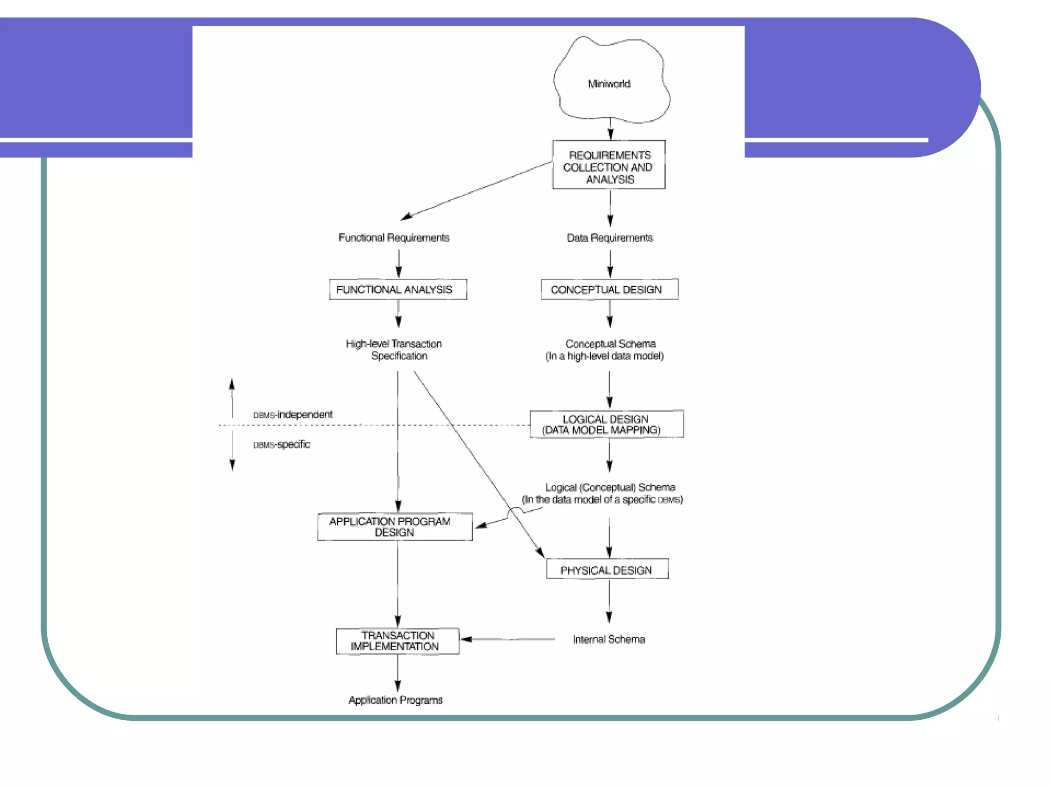 The document describes key concepts in entity relationship modeling including entity types, attributes, relationships, keys, and constraints. It provides an example database application to track employees, departments, and projects within a company. It then defines entity types for departments, projects, employees, and dependents with their attributes. It also describes relationship types, cardinalities, roles, and other modeling constructs used to design the conceptual schema.