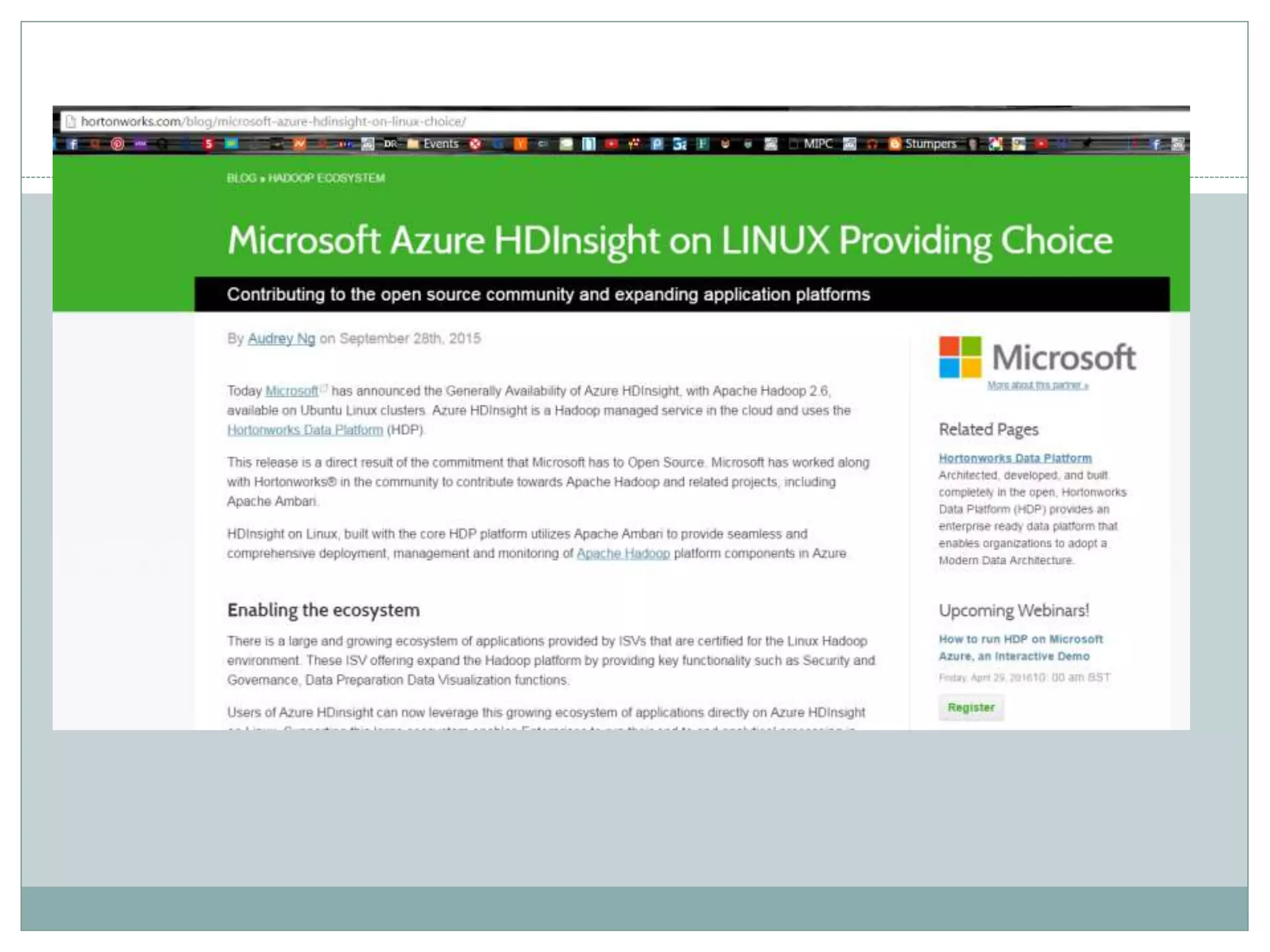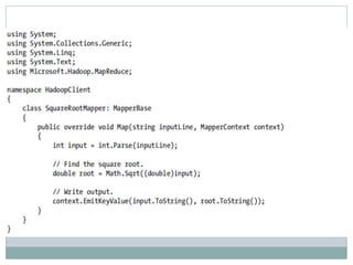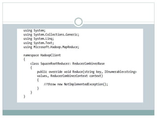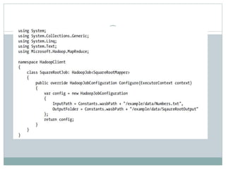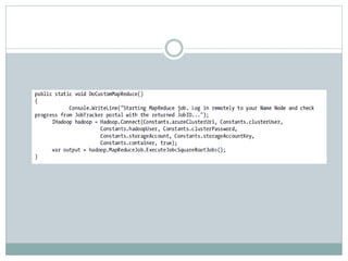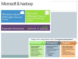 The document presents insights from a talk by Adnan Masood, Ph.D., on data science using Microsoft Azure, focusing on machine learning and Hadoop frameworks. It explains the architecture and functionality of Hadoop and MapReduce, highlighting their applications in various fields, and introduces Apache Spark as a high-performance computing solution. Key players in the Hadoop ecosystem, including Hortonworks and Cloudera, are discussed, alongside the role of cloud service providers like AWS and Google in delivering Hadoop-as-a-Service.
