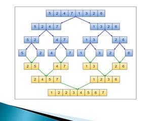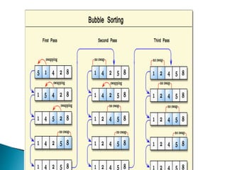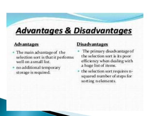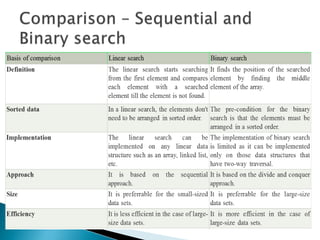 The document discusses various searching and sorting algorithms. It begins by defining searching as finding an item in a list. It describes sequential and binary search techniques. For sorting, it covers bubble, selection, insertion, merge, quick and heap sorts. It provides pseudocode examples and analyzes the time complexity of algorithms like selection sort and quicksort. Key aspects covered include the divide and conquer approach of quicksort and the efficiency of various sorting methods.