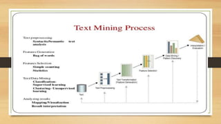 The document provides a comprehensive comparison of data mining, text mining, and web mining, highlighting their definitions, techniques, applications, and similarities and differences. Data mining focuses on discovering patterns from large datasets, text mining extracts information from textual sources, and web mining analyzes data from the internet. It concludes that while all three methods share certain techniques like classification and clustering, they differ in data formats, storage, and their specific approaches to mining.