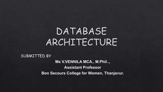 Database architecture uses programming languages to design software for businesses, focusing on designing, developing, implementing, and maintaining computer programs. The architecture of a database system depends on the computer system it runs on, and a database system can be centralized or use a client-server model with client machines for users and a server for the database system.