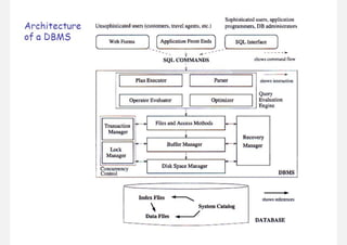 The document provides an overview of database systems, comparing file systems with database management systems (DBMS), and discussing concepts such as data models, relational models, and the entity-relationship (ER) model. Key topics include database design, integrity constraints, transaction management, and the importance of data independence and security. Historical perspectives on the evolution of database technology from the 1960s to the 1990s are also outlined.