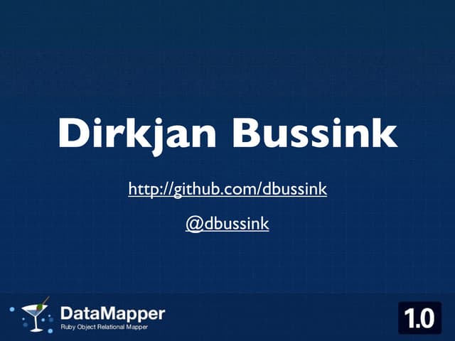 This document provides an overview of DataMapper, an object-relational mapper (ORM) library for Ruby applications. It summarizes DataMapper's main features such as associations, migrations, database adapters, naming conventions, validations, custom types and stores. The document also provides examples of how to use DataMapper with different databases, import/export data, and validate models for specific contexts.