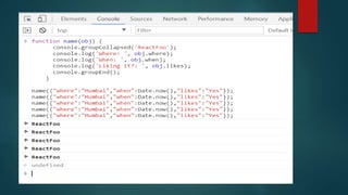 This document discusses debugging JavaScript and provides tips for leveraging browser developer tools. It begins by noting common issues that make JavaScript debugging stressful like using loose equality checks and minified code. It then outlines features of the browser console like console.log and advanced debugging techniques using the Network, Performance, Memory, and React tabs. Differences in developer tools across Chrome, Edge, and Firefox are highlighted. Finally, it introduces TrackJS for monitoring applications in production and tracking errors.