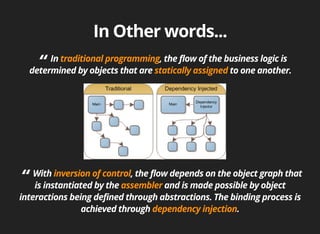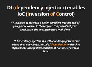 The document discusses dependency injection (DI) in Angular and how it is used to configure services. It provides examples of different service types - constant, value, factory, service, and provider - and how they are registered and injected. The ngRoute module is also summarized as the core routing module in Angular that uses directives to render templates based on routes.