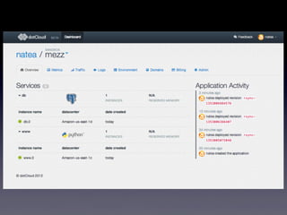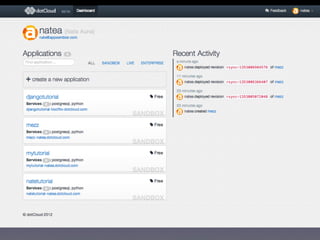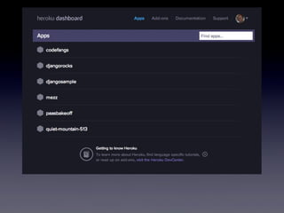 The document outlines the concept of Platform-as-a-Service (PaaS) for deploying Python applications efficiently, contrasting it with traditional infrastructure methods. It discusses the advantages of using PaaS, such as reduced operational overhead and ease of scaling, while listing various providers like Heroku, OpenShift, and Dotcloud. Additionally, it highlights configurations for Django applications on different PaaS platforms and considerations for when not to use PaaS.