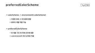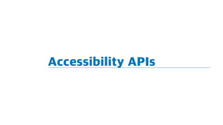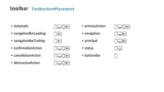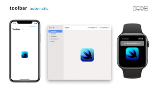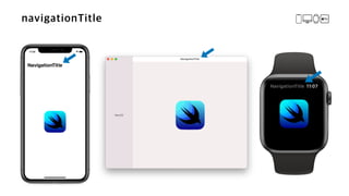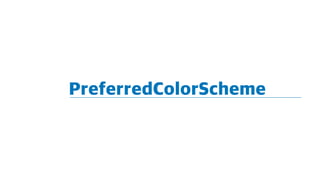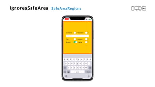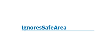 The document discusses SwiftUI APIs for accessibility, color schemes, navigation bars, and ignoring safe areas. Specifically, it provides documentation on functions like accessibilityHidden(_:), preferredColorScheme(_:), navigationBarTitle(_:), and ignoresSafeArea(_:edges:). It notes some APIs are deprecated and renamed in newer versions of iOS/macOS/tvOS/watchOS.