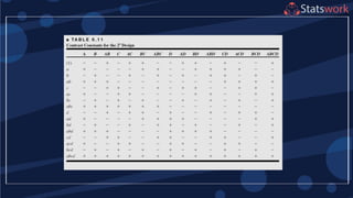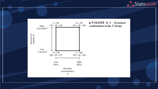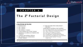 The document discusses the 2k factorial design, which is a special case of the general factorial design with k factors at two levels. It provides examples of using 2k factorial designs to investigate how multiple factors affect a response. For an unreplicated 2k design with no replication, there are challenges in statistical testing due to having zero degrees of freedom for error. Various methods are discussed for analyzing the effects in an unreplicated 2k design, such as normal probability plotting, Lenth's method, and conditional inference charts. Transformation of the response may also be needed to meet assumptions of the model such as equal variance.
