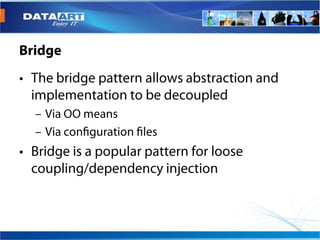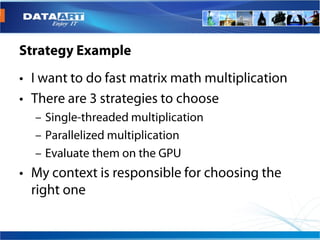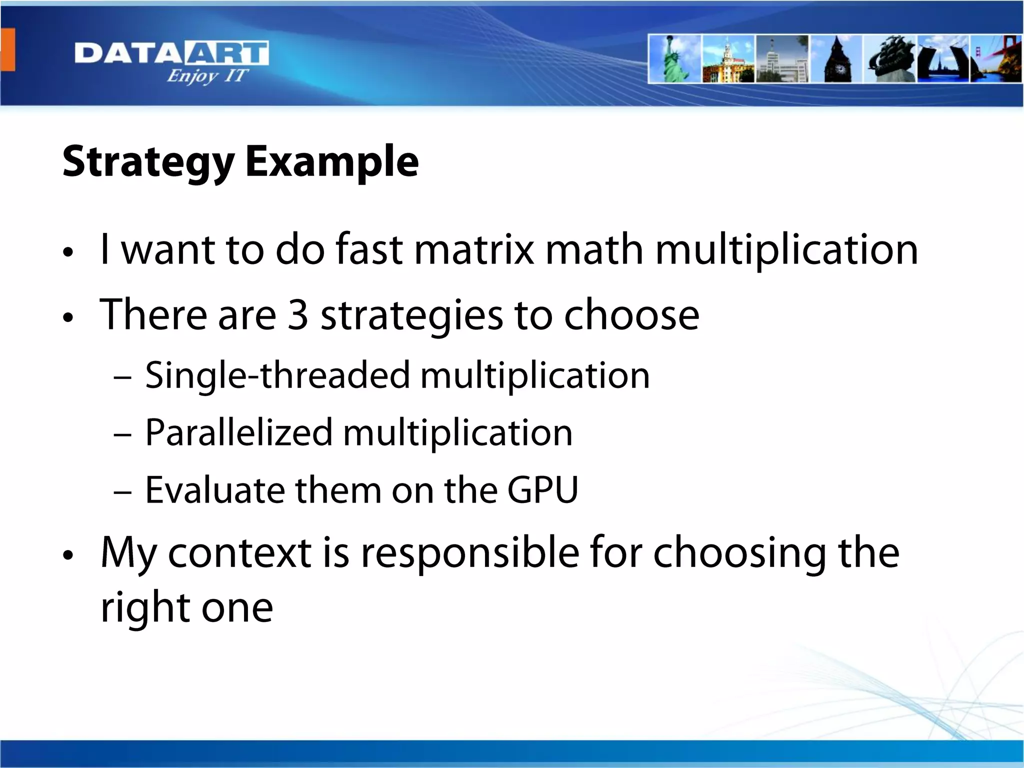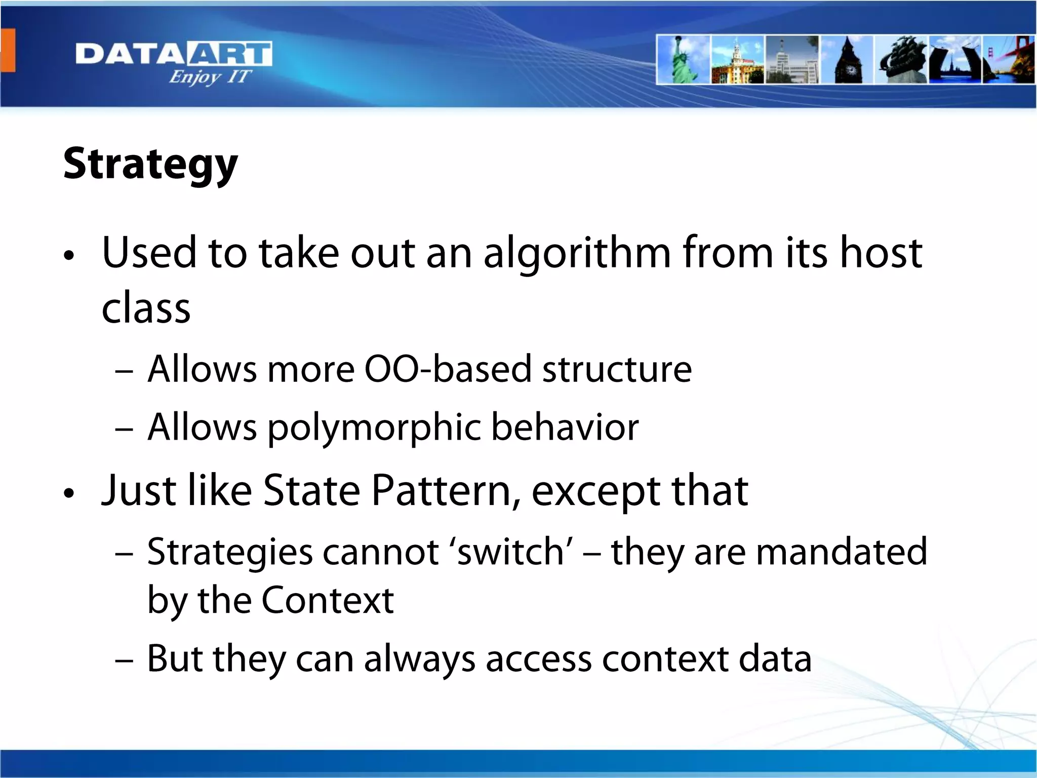 3. Strategy pattern which defines a family of algorithms, puts each of them in a separate class, and makes their objects interchangeable. This allows selection of algorithms at runtime based on context.