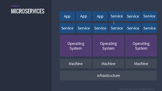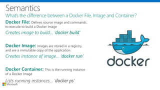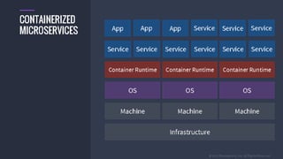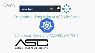 The document discusses moving from a monolithic .NET application hosted on Azure App Services to a microservices architecture using containers and Kubernetes on Azure Container Service. It outlines some pros and cons of the monolithic approach versus microservices, including improved scalability, testability and deployability with microservices. It then shows the new architecture with React.js frontends, Node.js microservices running in containers orchestrated by Kubernetes on ACS, with VSTS for continuous integration and delivery.