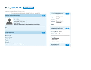 This document provides a technical summary of a complex integration using Dexterity to manage member profiles and synchronize data between a Plone website and a Salesforce CRM for the nonprofit Net Impact. Key features included editable member profiles, searchable member directories, multi-level privacy workflows, and nightly syncing of member data between the two systems. Custom behaviors, schemas, and forms were developed to handle things like member roles, profile editing, and converting Salesforce IDs to Plone UUIDs.