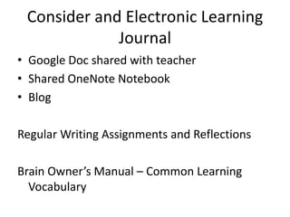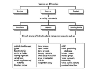 This document discusses differentiation strategies for meeting the needs of diverse learners. It describes Sternberg's three types of intelligence and the need for students to take in and process information in different ways. The goal of differentiation is to ensure all students understand essential concepts. Effective strategies include pre-assessing students, formative assessments, tiered assignments, alternative assessments, and student choice. Jigsaw activities, graphic organizers, and learning journals can also help teachers differentiate instruction to engage students and develop their understanding.