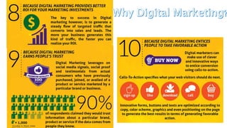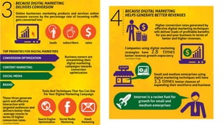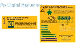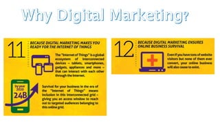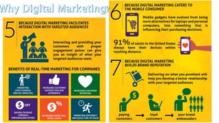 The document discusses digital marketing as a vital business component, emphasizing its role in building relationships and trust through various online channels like SEO, SEM, content marketing, and social media. It highlights the benefits of digital marketing, such as 24/7 availability, cost-effectiveness, global reach, and opportunities for instant feedback. Additionally, it notes that digital marketing allows for easy brand promotion and effective measurement of marketing activities.