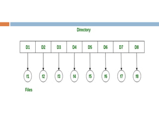 This document discusses directory structures and file system mounting in operating systems. It describes several types of directory structures including single-level, two-level, hierarchical, tree, and acyclic graph structures. It notes that directories organize files in a hierarchical manner and that mounting makes storage devices available to the operating system by reading metadata about the filesystem. Mounting attaches an additional filesystem to the currently accessible filesystem, while unmounting disconnects the filesystem.