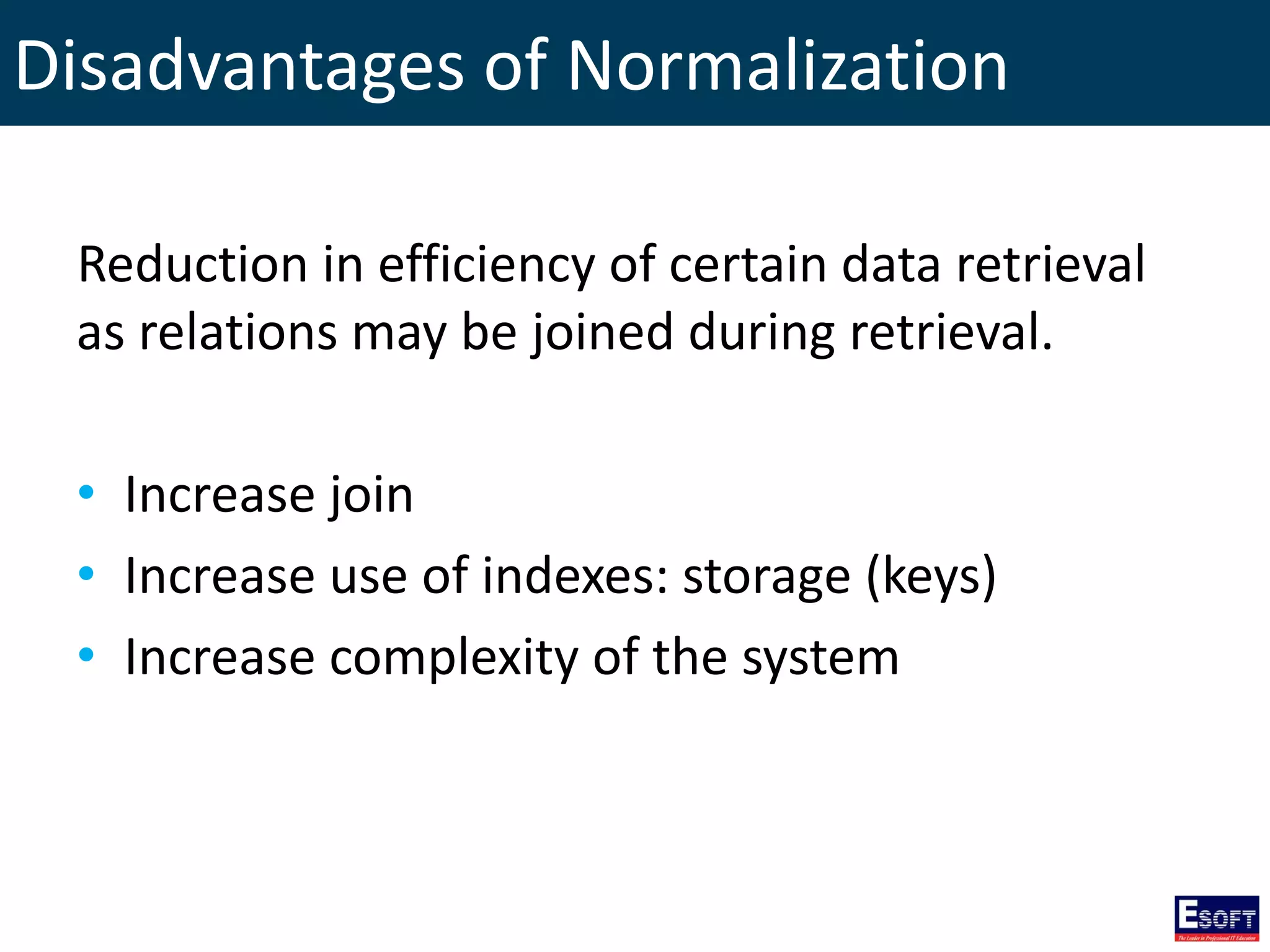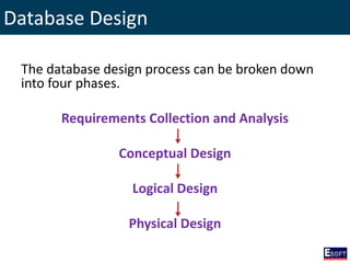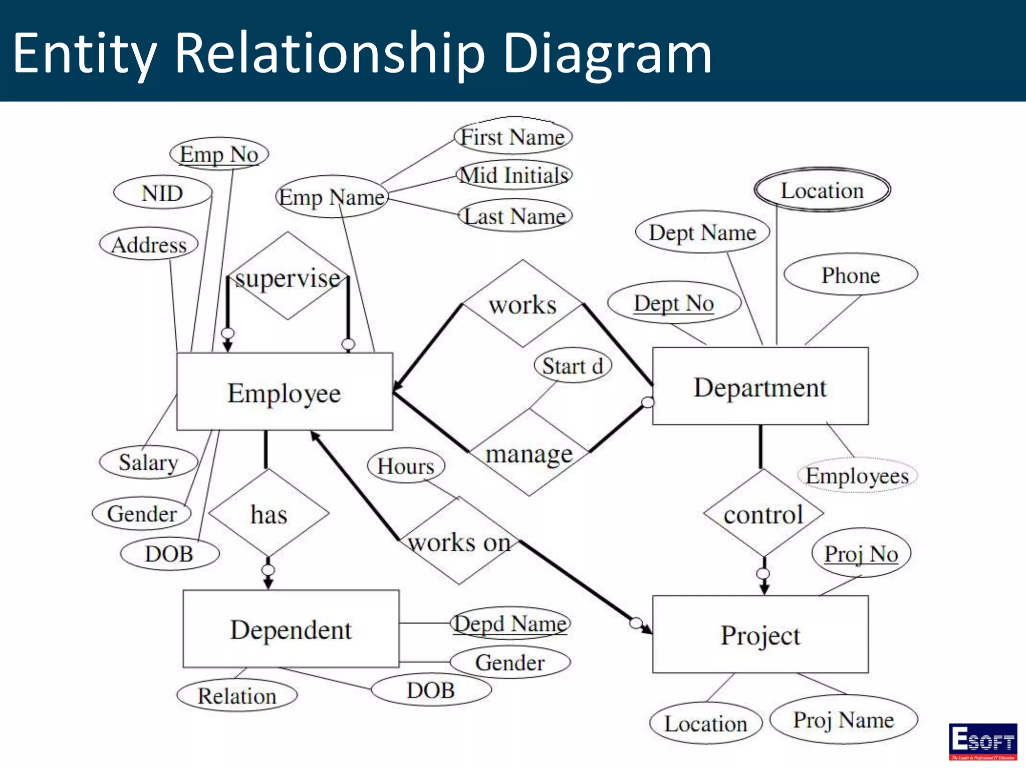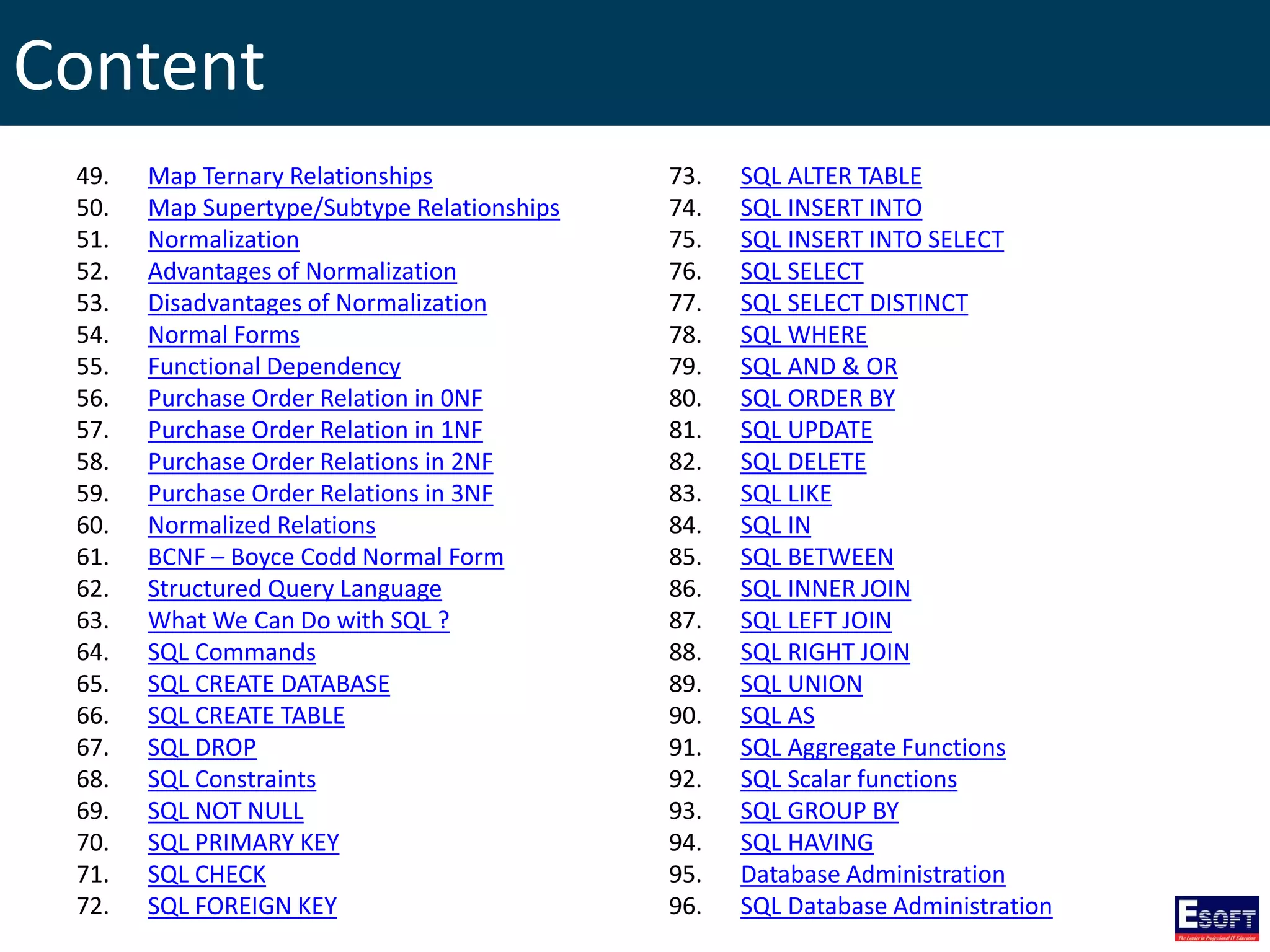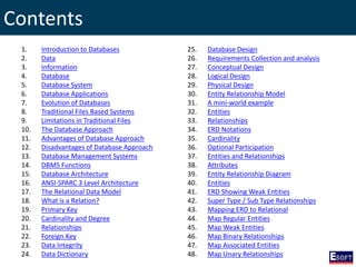 The document outlines a comprehensive curriculum for a Diploma in Software Engineering, focusing on Database Concepts. It covers a variety of topics including database systems, design methodologies, normalization, and SQL commands essential for database management. Key concepts such as relationships, data integrity, and entity-relationship modeling are also detailed to provide foundational knowledge in database engineering.