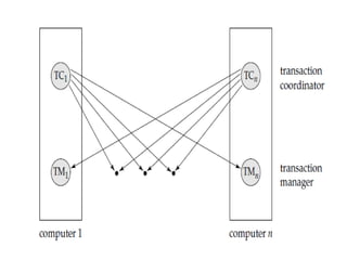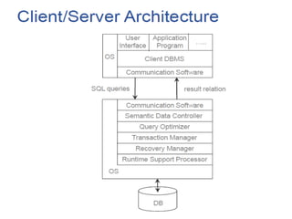 This document discusses distributed databases and client-server architectures. It begins by outlining distributed database concepts like fragmentation, replication and allocation of data across multiple sites. It then describes different types of distributed database systems including homogeneous, heterogeneous, federated and multidatabase systems. Query processing techniques like query decomposition and optimization strategies for distributed queries are also covered. Finally, the document discusses client-server architecture and its various components for managing distributed databases.