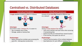 The document discusses distributed database systems, explaining their structure, goals, and the types, namely homogeneous and heterogeneous databases. It details data storage methods, including replication and fragmentation, along with their advantages and challenges, such as maintaining data consistency and recovery issues. Additionally, it highlights concurrency problems and various solutions, including locking mechanisms to manage multiple transactions effectively.