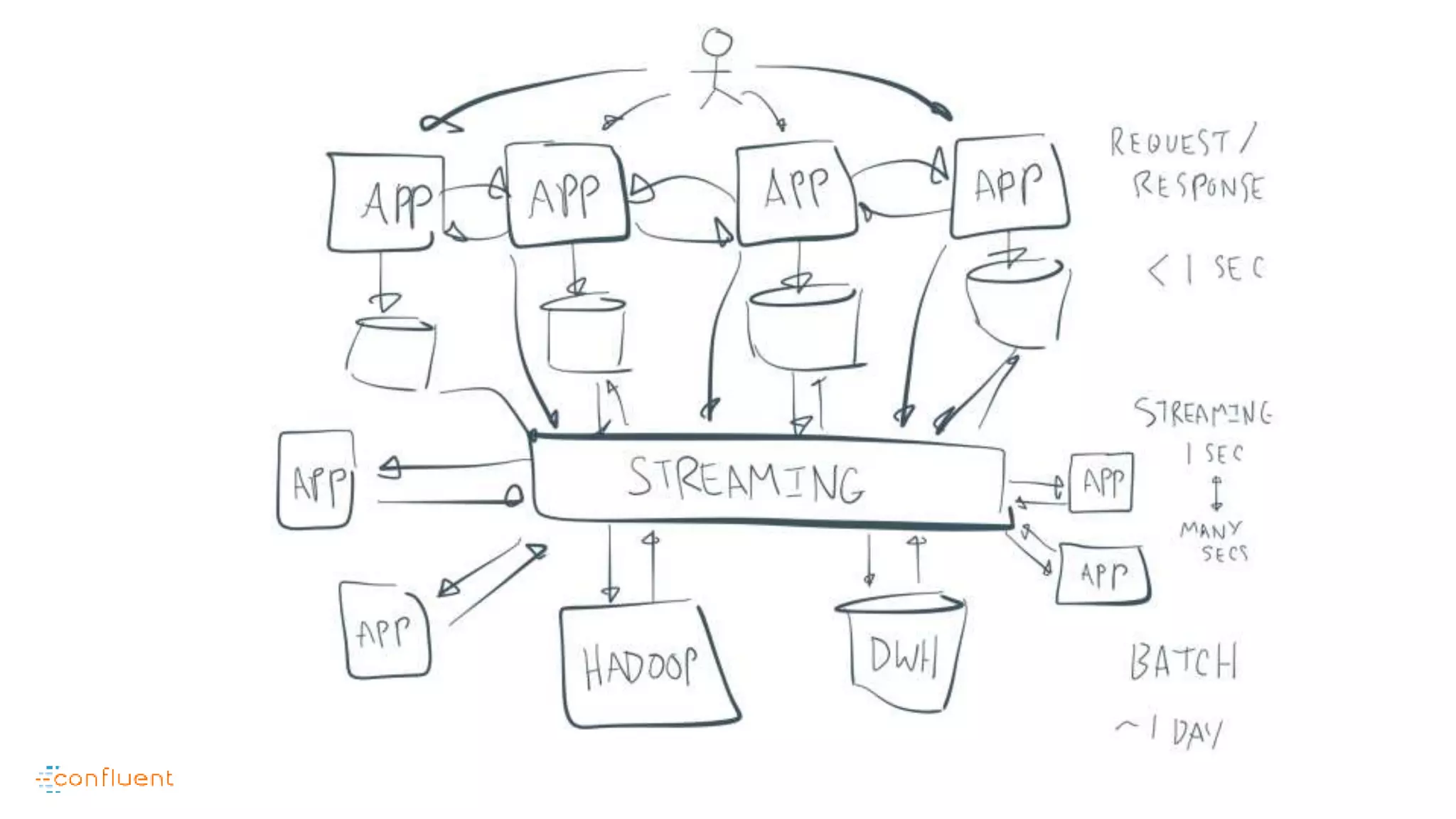 • #13 This is what that architecture looks like relying on streaming. Two key uses: Acts as a data pipeline between data systems and apps Acts as a backbone for streams of data for stream processing
