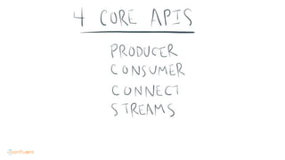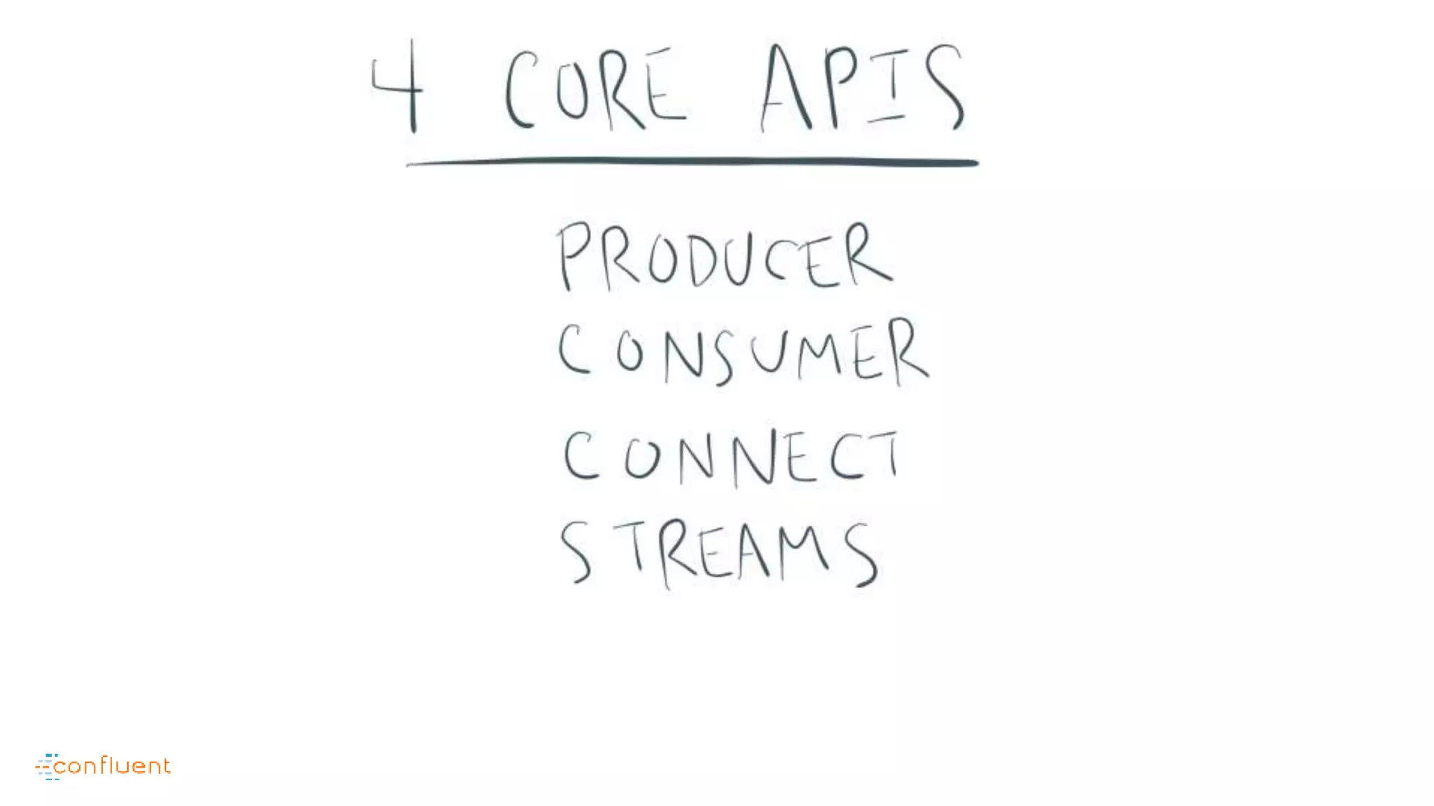 • #29 Four APIs to read and write streams of events First two are easy, the producer and consumer allow applications to read and write to Kafka. The connect API allows building connectors that integrate Kafka with existing systems or applications. The streams api allows stream processing on top of Kafka. We’ll go through each of these briefly.