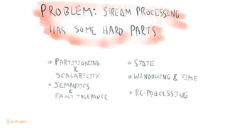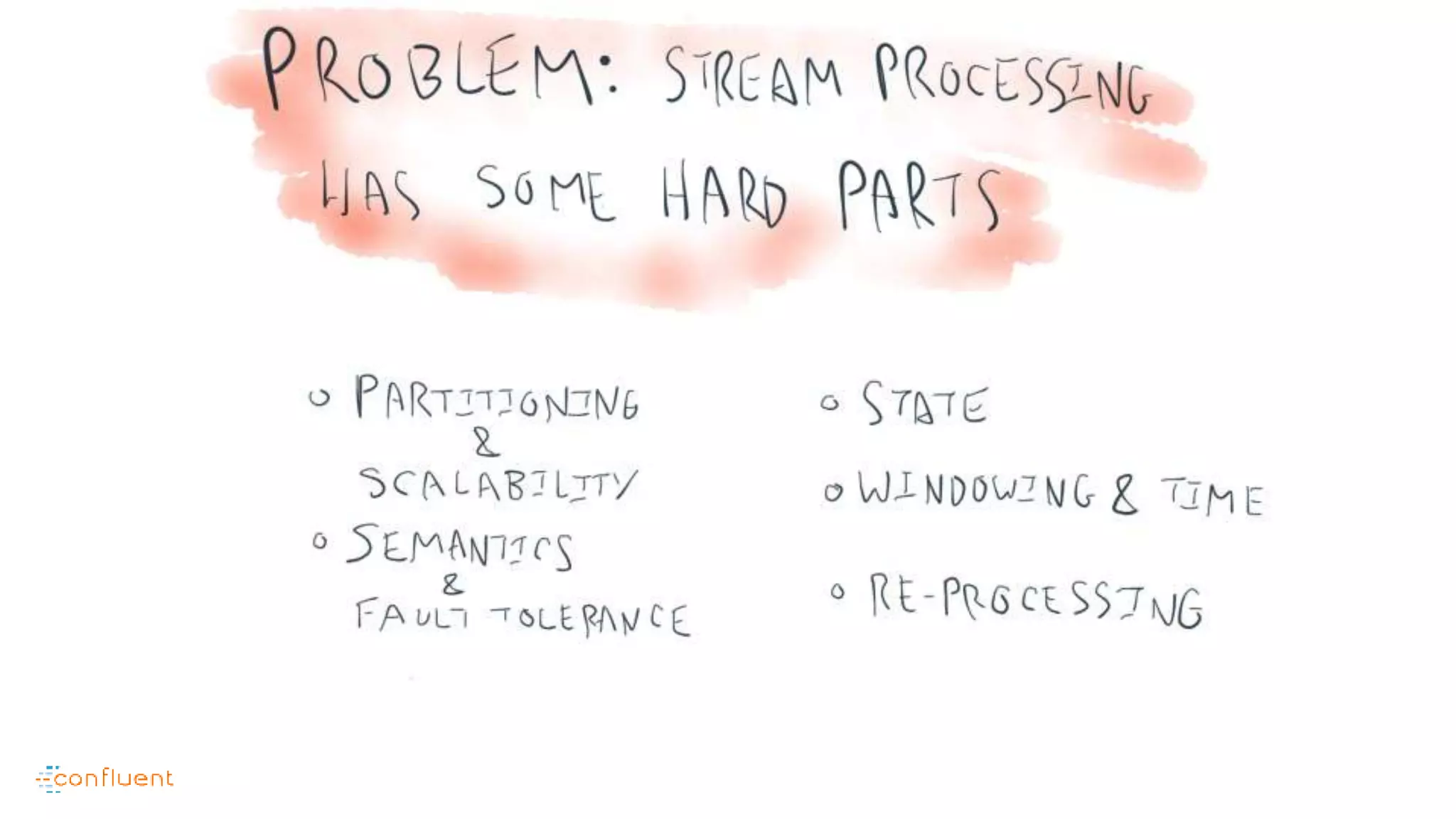 • #32 So in effect a stream processing app is basically just some code that consumes input and produces output. So why not just use the producer and consumer APIs? Well, it turns out there are some hard parts to doing real-time stream processing.