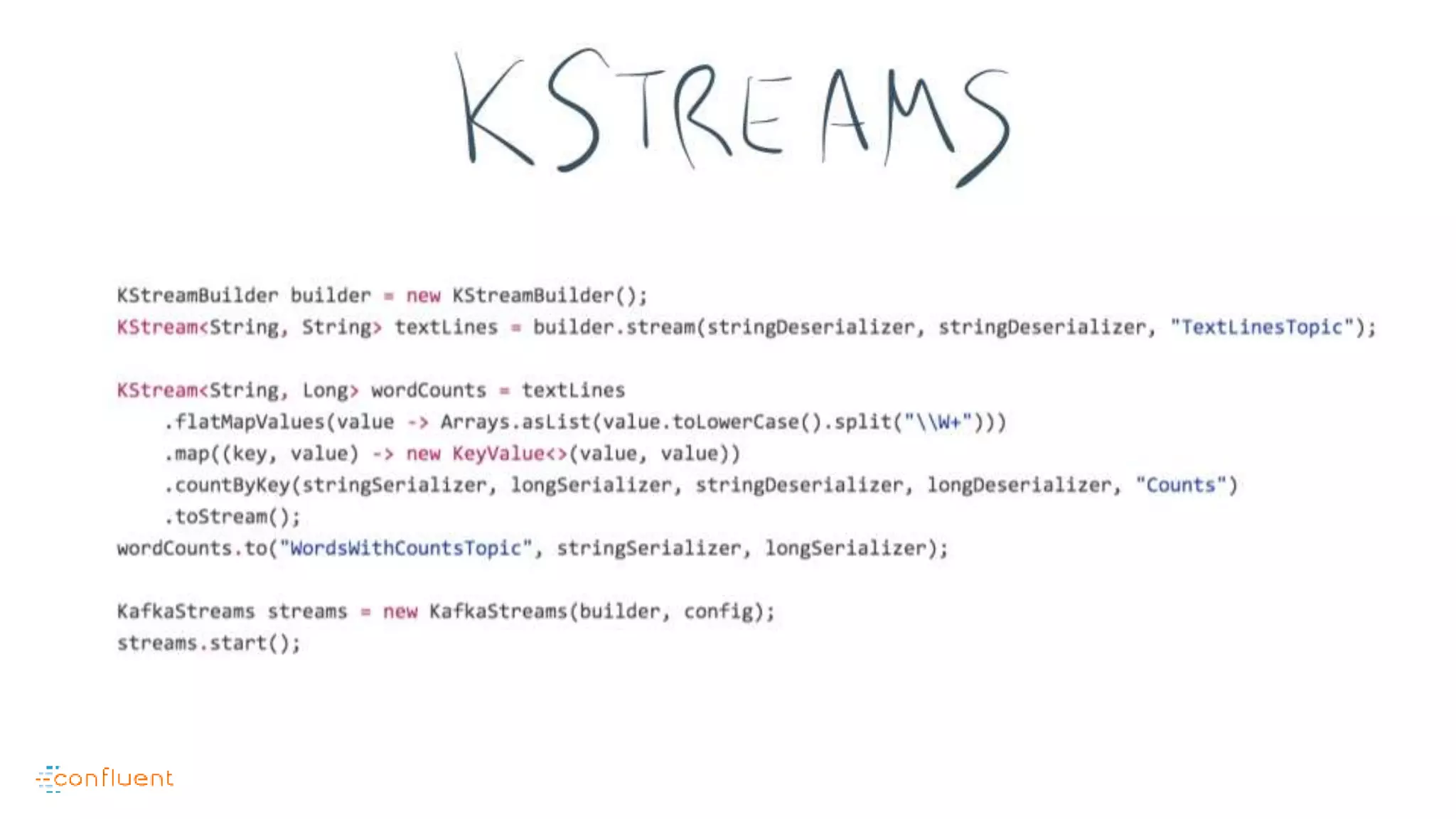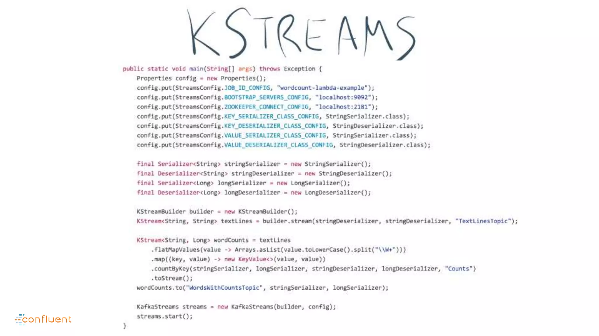 • #39 This is a simple java main method First, do some configutation to tell it which Kafka cluster to talk to Next tell it how to serialize this data. Then express my transformations. So if we zoom in on those transformations