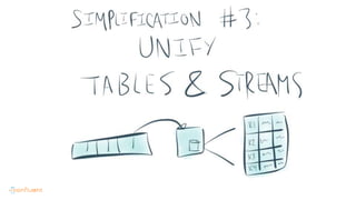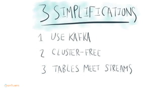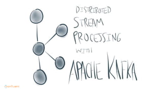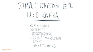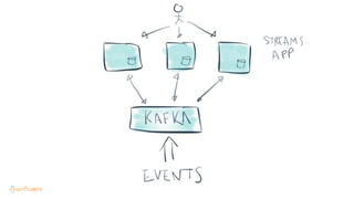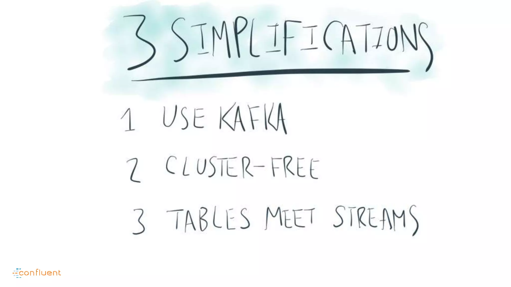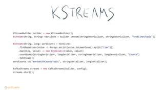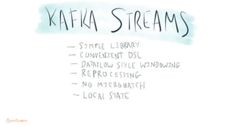 • #42 Simple library—takes input, let’s the app do transformation, publishes back results. Gives you a convenient, declarative DSL for doing transformations on data. Gives you powerful windowing capabilities based on the timestamp in the event so it handles out-of-order events well. Let’s you reprocess data. Works with low latency Allows powerful stateful processing for joins and aggregations.