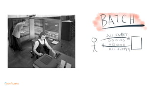 • #15 Lot’s of ways to categorize computer programs: maybe functional vs object oriented, or distributed vs centralized. One of the most central ways to categorize is how the program gets its iinputs and how those are are translated into outputs After all this is what computer programs do, right, they translate inputs into outputs. 3 major categorizes, the first two everyone knows: request/response and batch The third many people have never heard of, and those who have often misunderstand it.