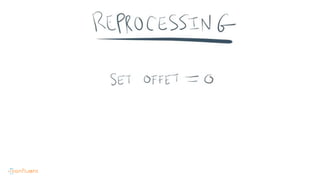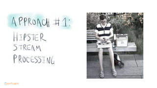 • #41 Could be wrong: don’t know shit about reactive Kafka is reactive in the sense of the “Reactive Manifesto” Similarity: declarative, observer pattern Fundamental difference: sync vs async services Huge difference in practical problem domain Doesn’t implement reactive streams api, in fact doesn’t even make any sense, no such thing as back pressure Sync services can just fail and send back an error Async services need to eventually process everything Reprocessing State