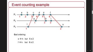 Logical clocks are mechanisms for capturing chronological and causal relationships in distributed systems that lack a global clock. Some key logical clock algorithms are Lamport's timestamps and vector clocks. Lamport's timestamps assign monotonically increasing numbers to events, while vector clocks allow for partial ordering of events. The algorithms for Lamport's timestamps and vector clocks involve incrementing and propagating clock values to determine causal relationships between events in a distributed system.