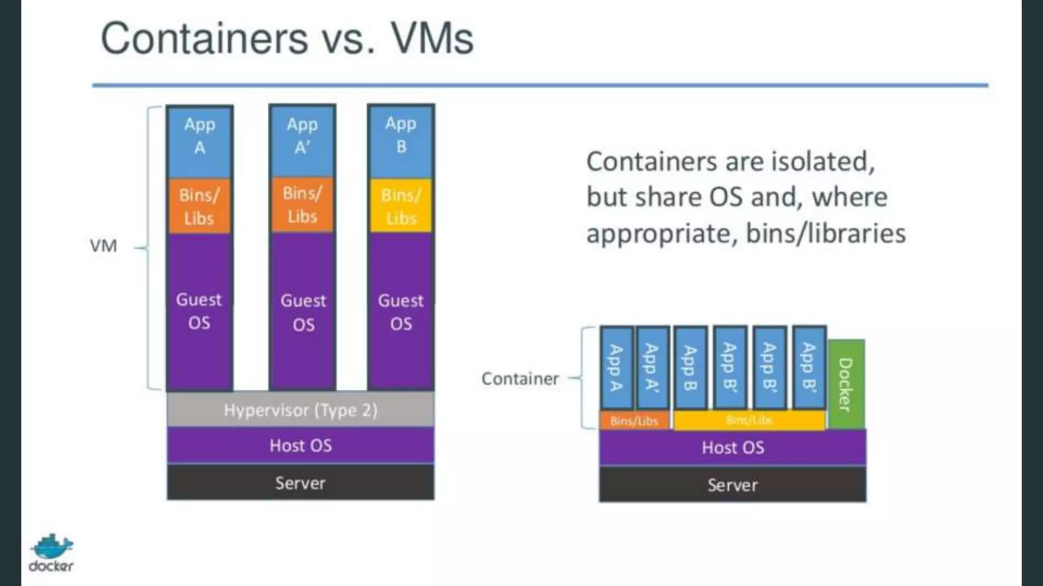 Docker provides a standard way to package applications into containers that are portable and can run on any infrastructure. The containers isolate applications from one another and ensure that dependencies and configurations are included so applications always run the same. This allows developers to build applications once and deploy them anywhere without worrying about compatibility or missing dependencies. It also allows operators to configure applications once and run anything on their infrastructure efficiently by eliminating inconsistencies between environments.