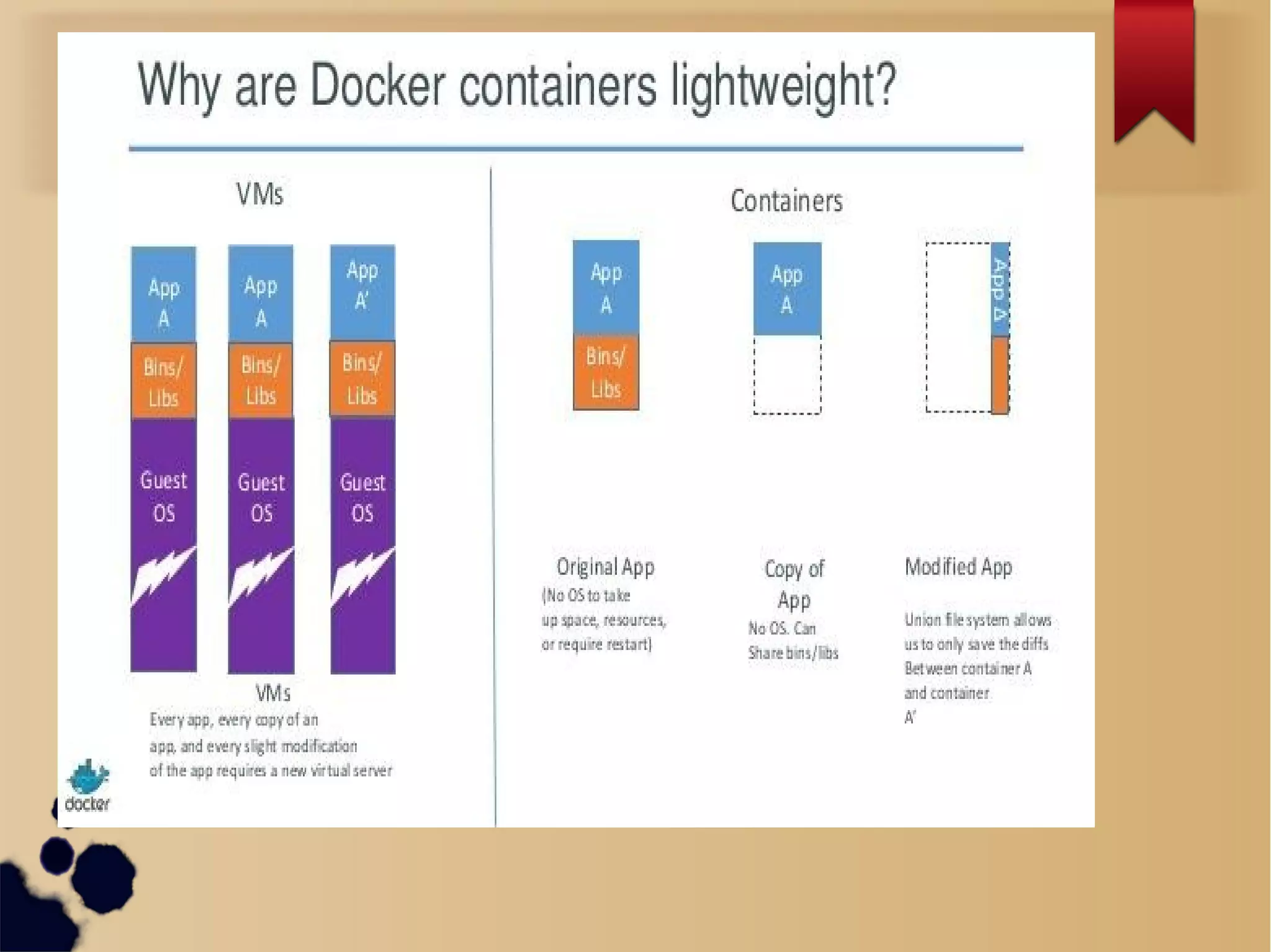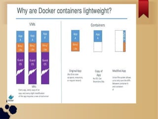 Docker allows users to package and run applications in lightweight containers. Containers are hardware and platform agnostic, making applications portable across computing environments from laptops to large servers. Docker utilizes Linux containers (LXC) which provide isolated mini operating systems within a host operating system without the overhead of virtual machines. Containers are more lightweight and efficient than virtual machines, allowing for faster deployment and scaling of applications. Docker makes containers reusable and provides a consistent environment for development and production.