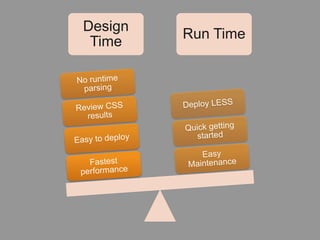 The document discusses the importance and benefits of using CSS, particularly in improving code organization through separation of concerns. It highlights challenges like browser interoperability and introduces CSS3 extensions as well as the LESS CSS preprocessor, which simplifies writing CSS via features like variables, mix-ins, and nested rules. The session encourages attendees to provide feedback and emphasizes the capability of doing more with less in styling web pages.