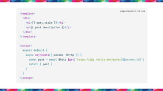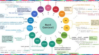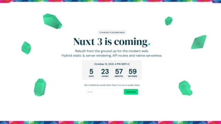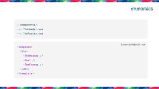The document outlines the integration of Nuxt.js with Drupal for developers, detailing the features and capabilities of Nuxt.js such as server-side rendering, routing, and module ecosystems. It provides guidance on project setup, connecting to Drupal APIs, and extending functionality through Nuxt modules. Additionally, it mentions the transition from Nuxt 2 to Nuxt 3 and highlights various resources for further exploration.