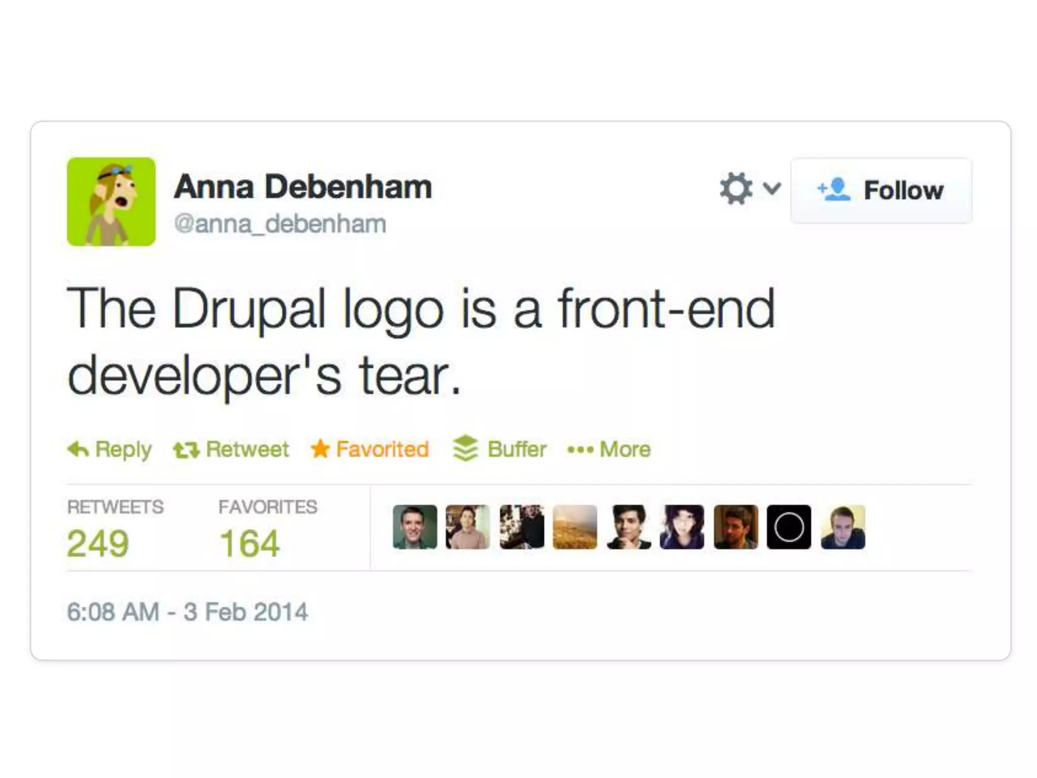 • #5 THAT IS WRONG.Javascript in your templates is like a timebomb. It will come back to get you.Why? Drupal doesn’t know it is there. - Bypasses aggregation - Bypassessminification - Stale versions can get stuck in caching