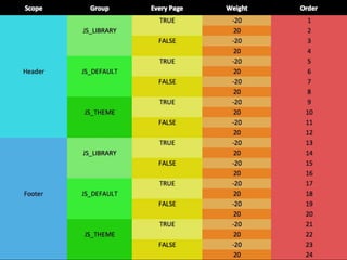 Working With drupal_add_js() LoadOrder scope group every_page weight drupal_add_js('js/example.js', array('group' => 'JS_LIBRARY’));