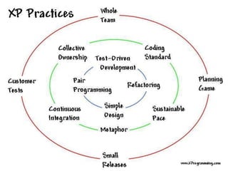 Extreme Programming (XP) is an agile software development methodology created in 1999 to enhance software quality and productivity amidst high ceremony approaches. It emphasizes core values such as communication and simplicity, alongside practices like pair programming and test-driven development. Challenges of XP include higher costs and potential noise in team dynamics, but its benefits outweigh these through improved design and team collaboration.