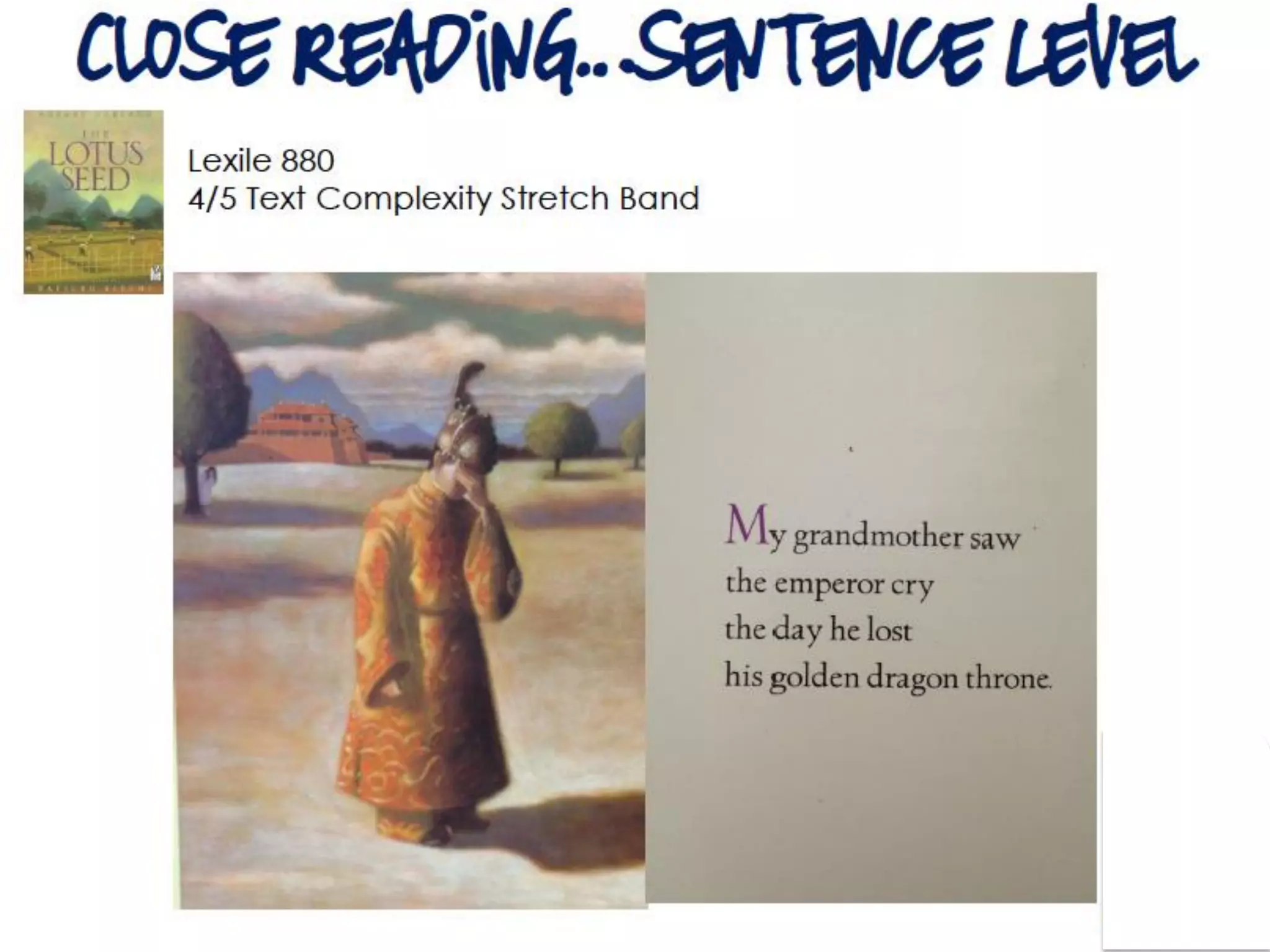 Text BASED Questions 1.The text says, “My grandmother was saw the emperor…” who’s telling the story? 2. Using evidence from the text and the illustration , infer where this story takes place. Tell how you know. 3. The author says, “he lost his golden dragon throne.” Talk about the author’s word choice of lost and how it’s used in the context of this page.