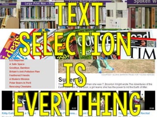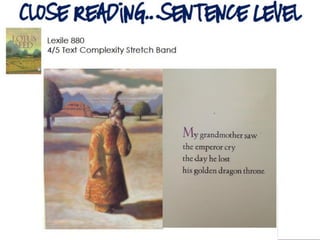 structure Complexity “The yellowsnow blower that my father bought for my mother for their 15th wedding anniversary last year is now sitting in the garage, under a pile of old boxes and newspapers, where she left it that night, just before she threw her mobile phone, the one with my pictures on it, at dad, and burst into tears.” …to explore the architecture of thoughts and feelings Source: Shanahan article “The Challenge of Challenging Text”