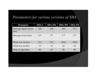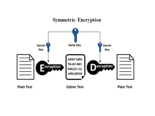 The document provides an overview of encryption algorithms and cryptography, defining key concepts such as encryption, decryption, keys, and steganography, and explaining their applications in information security. It details two main types of encryption: symmetric and asymmetric, with examples such as AES and RSA. Additionally, it discusses important hashing algorithms like MD5 and SHA, their workings, and known vulnerabilities, emphasizing the significance of secure communication.