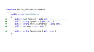 This document discusses event sourcing for Angular and React applications. It introduces a data storage maturity model ranging from 0 to 3, with event sourcing being level 3. Level 2 is Command Query Responsibility Segregation (CQRS), which separates read and write operations. Event sourcing stores all state changes as a sequence of events and allows reconstructing the entire state of an application. Projections are used to transform events into data views.