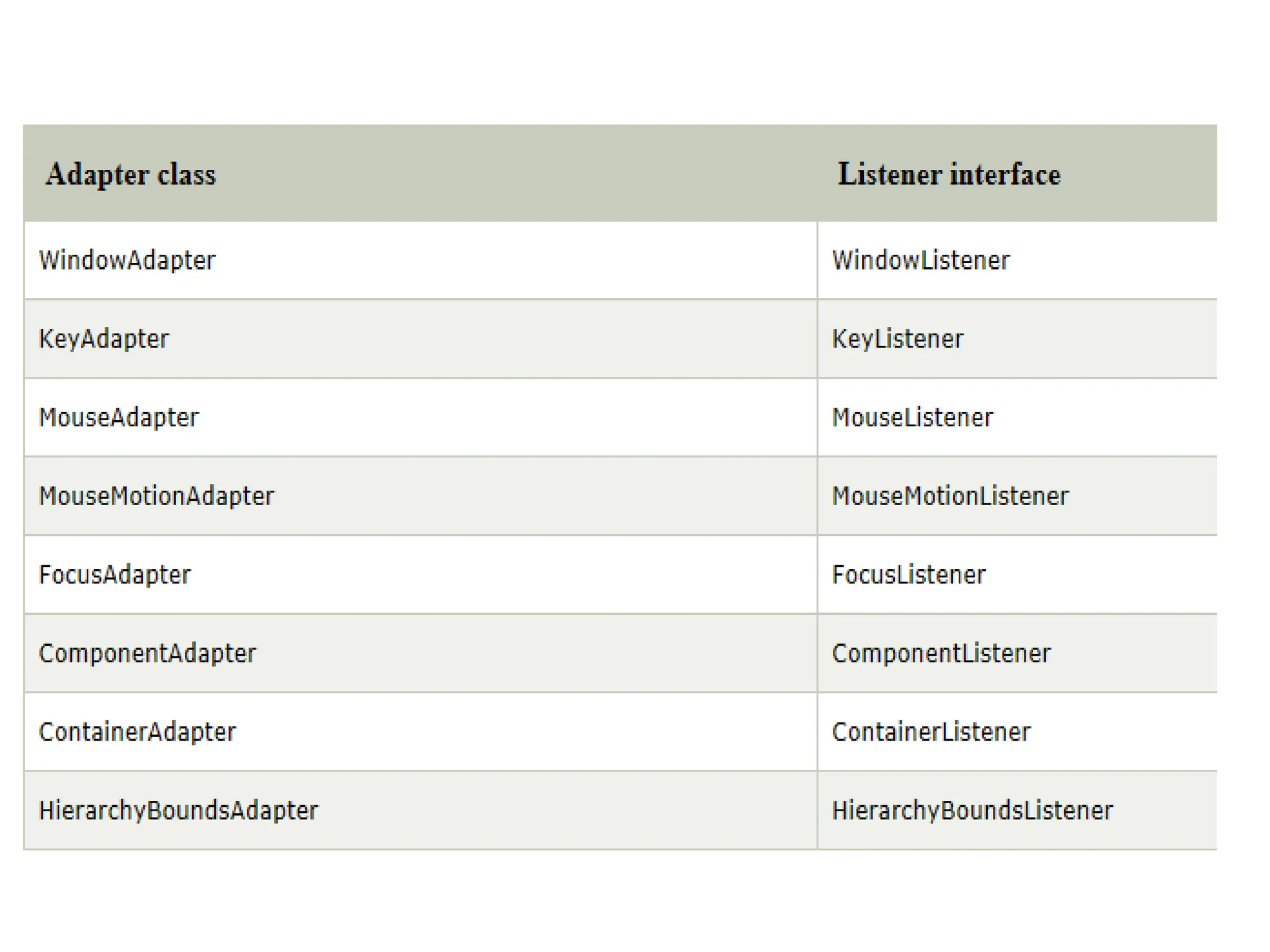 Adapter Classes adapter classesprovide the default implementation of listener interfaces. If we inherit the adapter class, you will not be forced to provide the implementation of all the methods of listener interfaces. The adapter classes are found in java.awt.event, java.awt.dnd and javax.swing.event packages