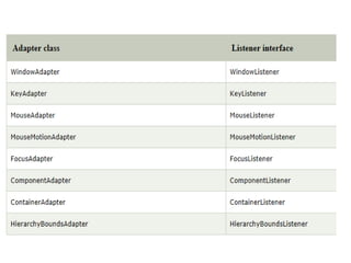 WindowAdapter import java.awt.*; import java.awt.event.*; publicclass AdapterExample{ Frame f; AdapterExample(){ f=new Frame("Window Adapter"); f.addWindowListener(new WindowAdapter(){ public void windowClosing(WindowEvent e) { f.dispose(); } }); f.setSize(400,400); f.setLayout(null); f.setVisible(true); } public static void main(String[] args) { new AdapterExample(); } }
