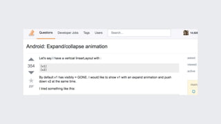The document discusses techniques for animating views and properties in Android using native animations. It covers animating values, view properties like scale and alpha, and layout parameters. It provides examples of animating the height of a view by changing its layout params and avoiding unnecessary layout passes. It also discusses potential issues like animating within scrollable containers and provides tips for optimizing animations.