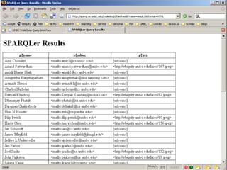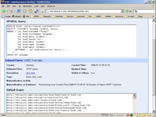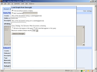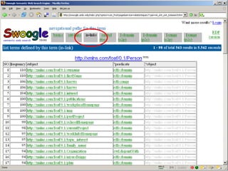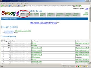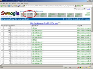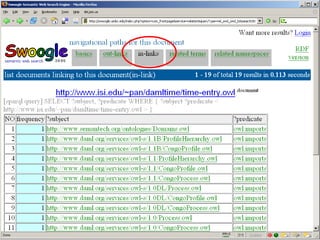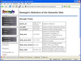 The document discusses Swoogle, a semantic web search engine implemented at the University of Maryland, which helps software agents access and understand data on the semantic web. It highlights its architecture, functionalities, and applications for semantic web developers, facilitating ontology discovery, data analysis, and use case tracking. The conclusion stresses the necessity for improved methods for discovering and reasoning over knowledge on the semantic web, indicating Swoogle's role in this evolving landscape.