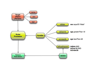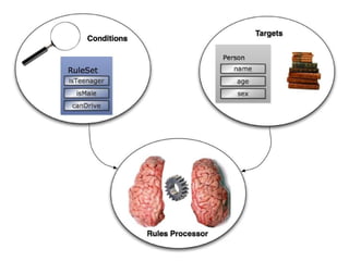 The document discusses business rules processing and rule engines, explaining what they are, how they work, and providing examples of using rules engines for client-side processing in Flex applications. It covers the basic and Rete algorithms for processing rules, describing how Rete is more efficient by storing rule patterns in a network structure and reusing computations. Real-world examples are provided of using a rules engine for a form builder and Herff Jones' order management system.