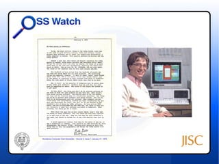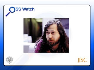 This document provides an overview of free and open source software (FOSS). It discusses the history and definitions of free and open source, how FOSS licensing works, and three common FOSS licenses: the GNU General Public License v2, Modified BSD License, and Mozilla Public License v2. The document traces the origins of FOSS to the 1970s and the work of Richard Stallman and the Free Software Foundation in the 1980s. It also discusses the founding of the Open Source Initiative in the late 1990s and key differences between free and open source perspectives.