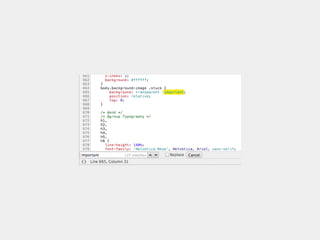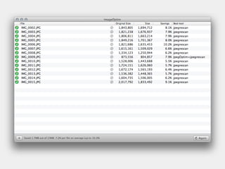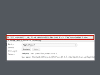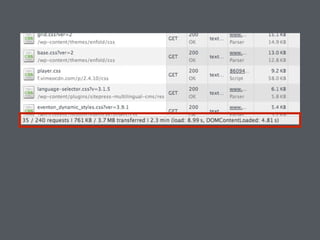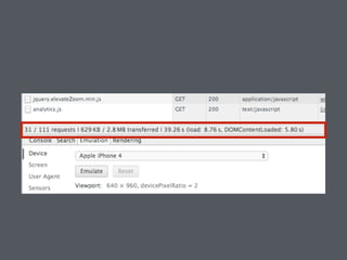 This document provides best practices, tips, and methodologies for front-end development, focusing on HTML, CSS, and JavaScript. Key topics include validation, reducing markup, naming conventions, and performance optimization, as well as tools like SMACSS, BEM, and CSS preprocessors. The presentation emphasizes the importance of image optimization, responsive design, and properly managing CSS and JavaScript for improved web performance.