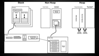 The document discusses the Java Virtual Machine (JVM) and its key components. It explains that the JVM is a virtual computing environment that executes Java bytecode. The bytecode is executed by the JVM using an operand stack. The document also discusses how objects and classes are represented in memory, including details on object headers, class file formats, and the classloading process. It concludes by mentioning the jdb debugging tool for debugging Java programs without an IDE.